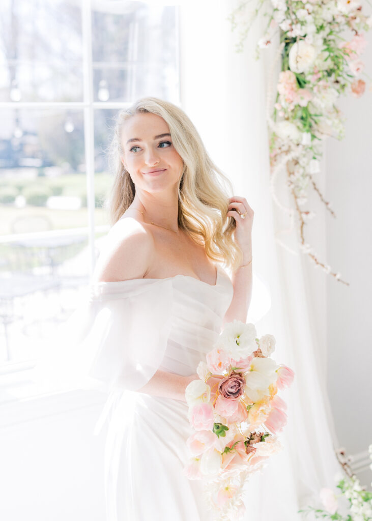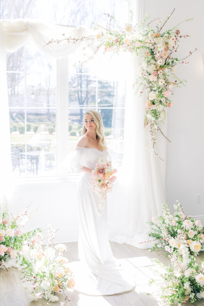 Florals in this editorial were designed to complement the architecture rather than compete with it. Soft textures paired with structured arrangements created a balanced look that felt organic yet refined.